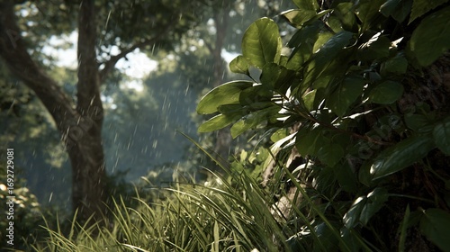Rain Falling on Green Forest with Large Leaves and Sunlight Filtering Through Trees