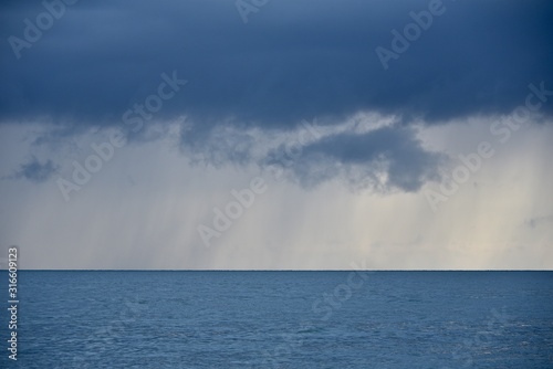 Rain over the sea. Sea landscape in blue tones.