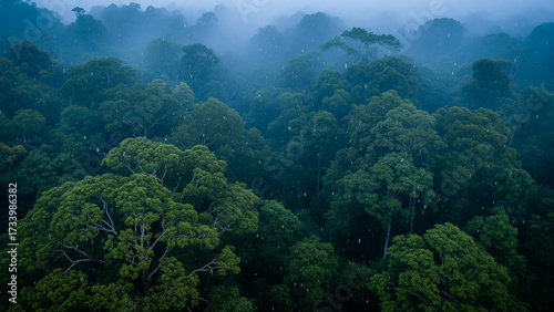 Rainforest in morning drizzle with soft mist. Wet canopy and blue-gray tones create peaceful imagery of resilience and moisture-rich climate systems.