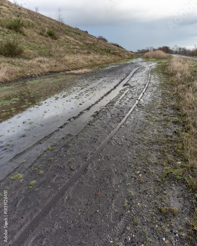 Rain-soaked dirt path through grassy terrain on a cloudy day