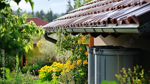 Rainwater Collection System by a Beautiful Flowering Garden near a Cozy Home