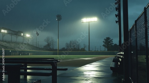 Rainy Baseball Field Under Stadium Lights at Dusk
