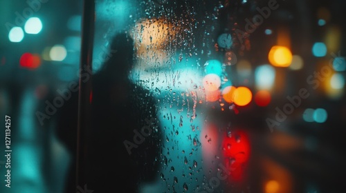 Rainy night city street view, blurred lights, person silhouette, bus shelter
