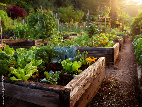 Raised garden beds bursting with colorful vegetables in a lively community garden filled with greenery and sunlight.