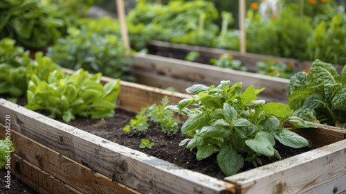 Raised garden beds filled with a variety of thriving green plants in a lush, well-maintained garden, emphasizing organized gardening and productive home farming.