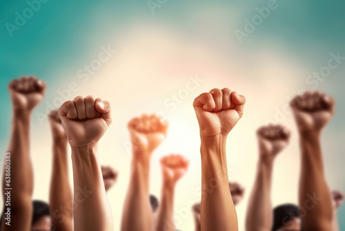 Raised hands on abstract background. Human rights and freedom concept.