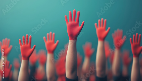 Raising red hands in crowd symbolizes unity and support