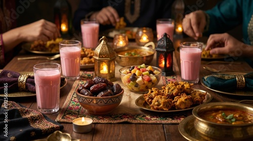 Ramadan iftar table with dates, fruit chaat and rose milk
