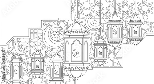 Ramadan Kareem: Elegant Line Art of Festive Lanterns, Stars, and Crescent Moons; Islamic Pattern Background.