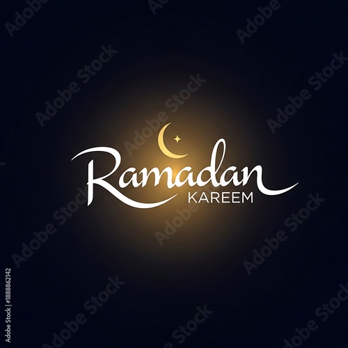 Ramadan kareem golden crescent moon and white typography on dark glowing night background