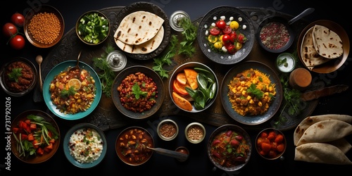 Ramadan kareem Iftar party table top view shot , assorted festive traditional arabic dishe