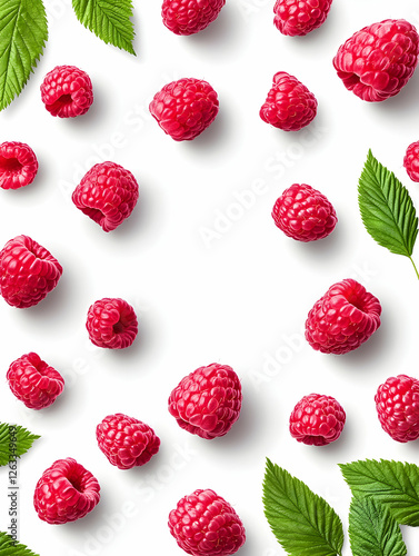 Raspberries and leaves on white background, summer snack concept, top view. Generative AI