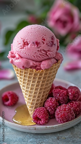 Raspberry rose sorbet in a cone with fresh raspberries and honey
