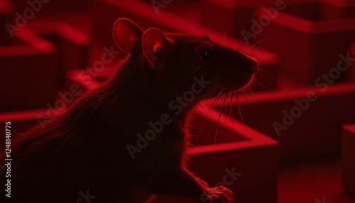 Rat silhouette navigating maze in glowing red light, abstract symbolism