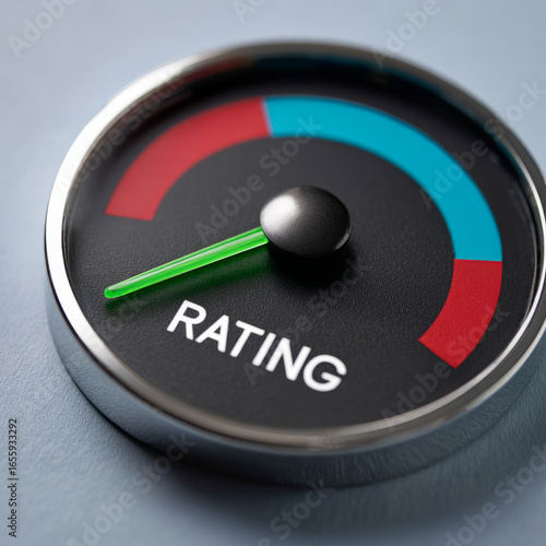 Rating gauge with indicator needle on color scale.