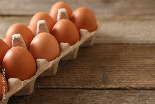 Raw chicken eggs in carton on wooden table, closeup. Space for text