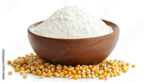 Raw corn flour in bowl isolated on white