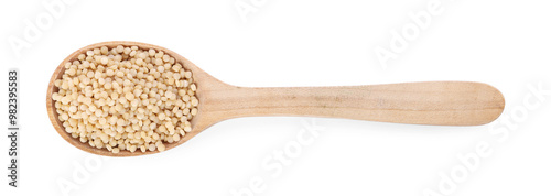 Raw couscous in wooden spoon isolated on white, top view
