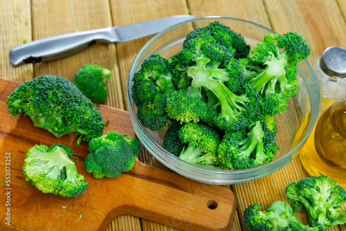 Raw fresh green broccoli pieces in glass bowl, vegetarian food