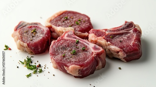 Raw lamb chops seasoned with herbs and pepper on white background