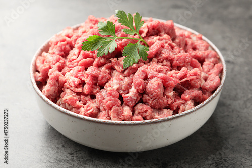 Raw minced meat with parsley on grey table, closeup
