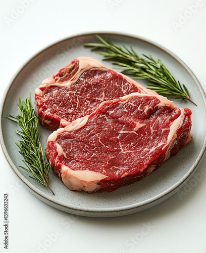 Raw Ribeye Steaks Freshly Prepared on a Plate with Rosemary