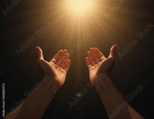 Reaching hands cup light, symbolizing hope, spirituality, and connection to a higher power.