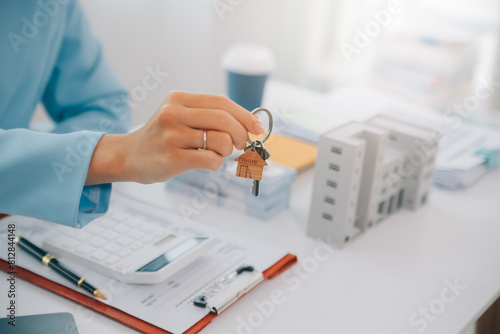 Real estate agent talked about the terms of the home purchase agreement and asked the customer to sign the documents to make the contract legally, Home sales and home insurance concept.
