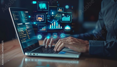 Real Estate Investment Trust (REIT) Concept: Businessman Working on Laptop with Icons Representing Property Investment, Financial Management, and REIT Strategies. Illustrating Modern Real Estate Portf