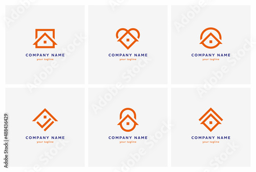 Real estate logo collection. Six house, home, roof line icons in different geometric shapes.