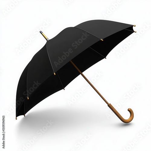 Realistic 3D Icon Cartoon of a Classic Black Umbrella with a Wooden Handle