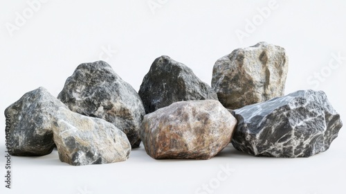 Realistic 3D render of a collection of large stone rocks arranged on a transparent background, each with unique textures and rugged surfaces