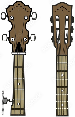 Realistic banjo neck and guitar neck. Isolated on white background.