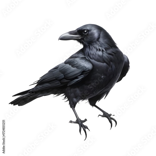 Realistic black raven illustration with glossy feathers and sharp beak on white background
