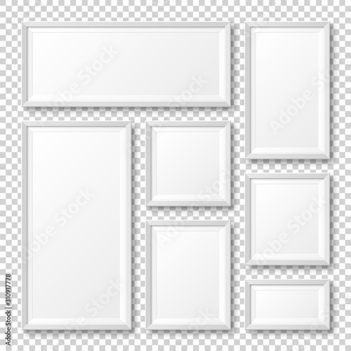 Realistic blank white picture frame with shadow collection isolated on transparent background. Modern poster mockup. Empty photo frame for art gallery or interior. Vector illustration.