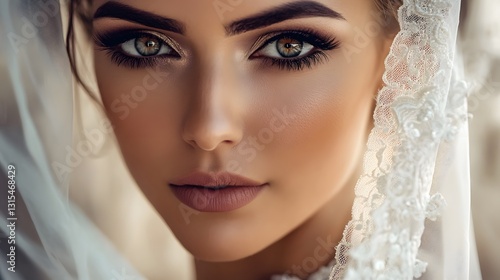 Realistic close-up of a bride’s face, with detailed makeup & an elegant veil. The focus is on her eyes, her skin & her makeup