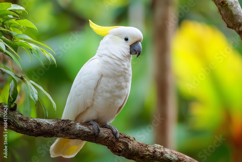 Realistic cockatoo perched on a tree branch, detailed white feathers and yellow crest, tropical background