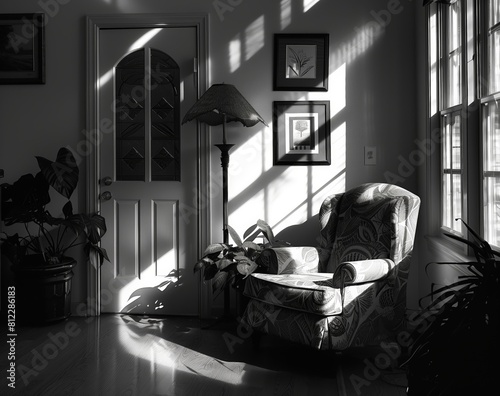 Realistic indoor 1940s black-and-white photograph of a tasteful upper-middle-class American living room, late afternoon sunshine. From the series �Golden Age," "Interiors.�
