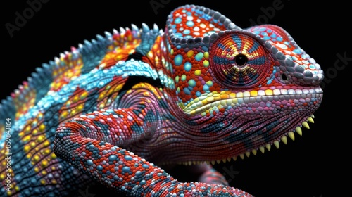 realistic multicolored chameleon with iridescent skin in speckles over black background