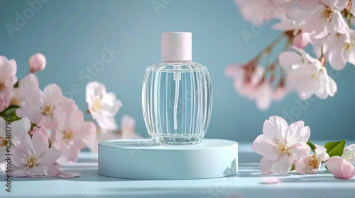 Realistic pink perfume bottle on the catwalk to advertise a perfume brand