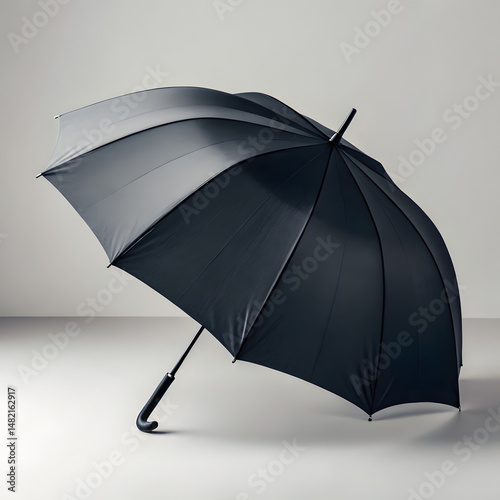 Realistic rain umbrella mockup with black fabric canopy on beige studio background, perfect for waterproof gear branding or product packaging design