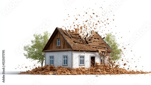 Realistic Scene of an Exploded House with Fragments Scattered Around and Trees in Surrounding Context