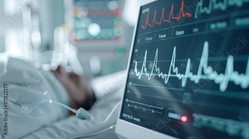 Real-time heart wave displayed on smart medical monitor, patient under surveillance, advanced tech, clear and detailed interface, innovative healthcare