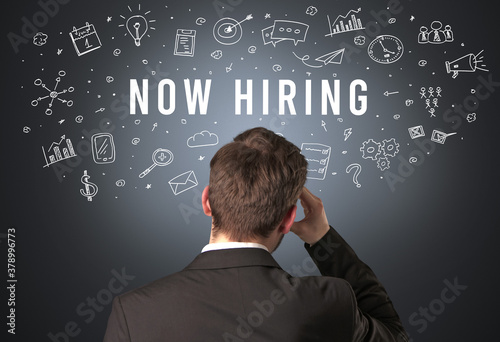 Rear view of a businessman with NOW HIRING inscription, modern business concept