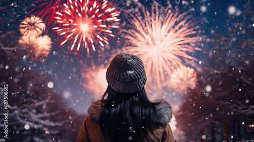 Rear view of woman watch their New Year fireworks display amazement and delight in a snowy park in front of firework display, generative ai