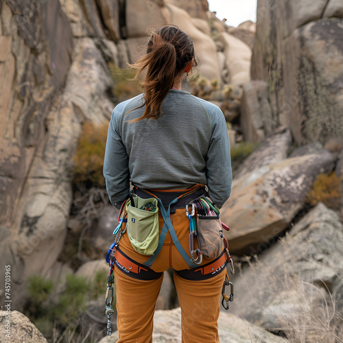 Rear view of Woman wearing in climbing equipment standing, Generative AI
