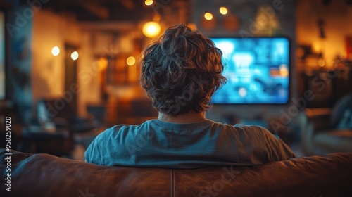 Rearview photography of a man sitting in a living room at night, watching TV, with a warm and cozy ambiance created by dim lighting and soft furniture