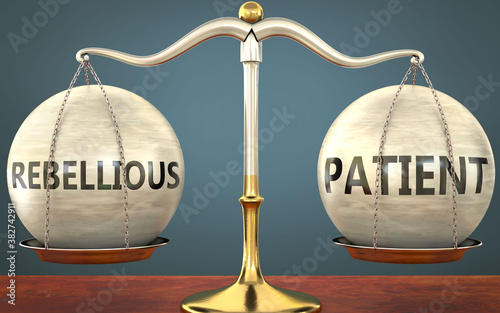 rebellious and patient staying in balance - pictured as a metal scale with weights and labels rebellious and patient to symbolize balance and symmetry of those concepts, 3d illustration