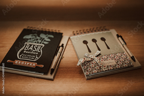 Recipe notebooks on wooden background