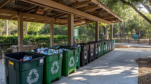 Recycling Drop-Off: A recycling drop-off point with multiple bins for different materials (paper, plastic, glass) all featuring the universal recycling symbol. The area is clean and well-organized.